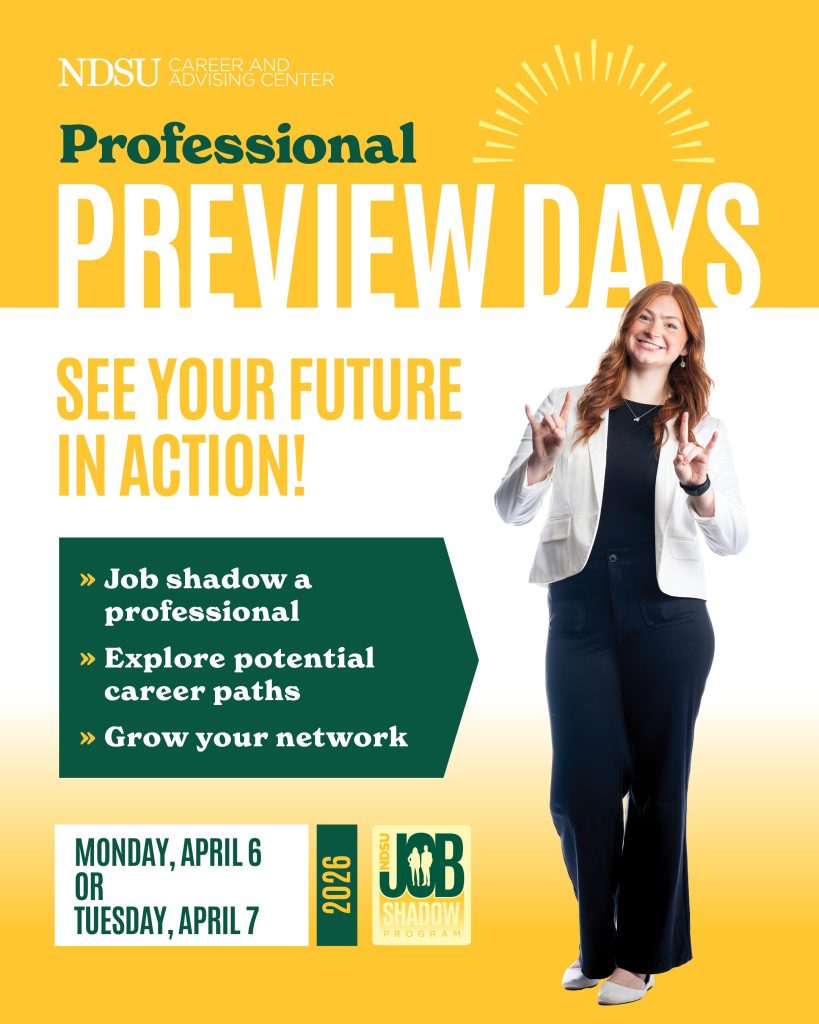 Join us for the NDSU Professional Preview Days on April 6-7 to take part in this exciting program. Contact shayla.schumacher@ndsu.edu with questions or for more information.